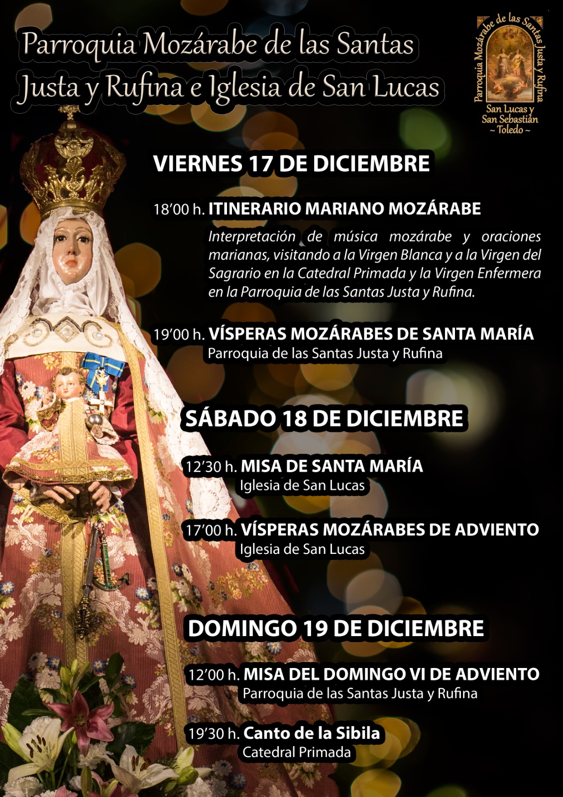 La hermandad de Caballeros y Damas mozárabes de Toledo, vuelve a retomar su actividad y su día a día tras este duro y convulso año y medio, donde todos hemos estados envueltos en una pandemia mundial, que ha interrumpido nuestros quehaceres habituales y hemos tenido que enfrentarnos a otras actividades totalmente distintas a las que veníamos realizando, tal vez asentadas en la rutina y la comodidad. Como Hermandad hemos descubierto (o más bien, hemos redescubierto) que, en situaciones conflictivas o complicadas, UN POCO ES UN MUCHO, con un poquito que cada hermano aporte cuantas cosas se pueden conseguir para el bien comunitario. Debemos tener presente, que este es el principal fin de una hermandad, aportar para hacer el bien al prójimo, siempre desde la Fe en Cristo y el amor a su Madre, nuestra Madre. Y de esta manera Los Caballeros y Damas Mozárabes de Toledo, ya con tres Cabildo ordinarios realizados, donde se ha tratado de encauzar la actividad de la Hermandad, queremos seguir normalizando nuestros actos y para ello el próximo día 18 del corriente, celebraremos la festividad de nuestra Patrona y Protectora Santa María de la Esperanza. Nuestro Prior, el Muy Ilustre Sr. Don José Antonio Martínez García, párroco de la Parroquia mozárabe de Santa Justa y Rufina y San Lucas, ha organizado una serie de actividades: - Viernes 17, a las 18 horas, itinerario Mariano Mozárabe, con interpretación de música mozárabe y oraciones marianas, visitando a la Virgen Blanca y a la Virgen del Sagrario en la Catedral Primada, y a la Virgen Enfermera en la parroquia de Santa Justa y Rufina. A las 19 horas, Vísperas Mozárabes de Santa María. Parroquia de Santa Justa y Rufina. - Sábado 18, en la Iglesia de San Lucas, a las 12,30 horas, Misa de Santa María, acto central de nuestra hermandad. A las 18:15 horas, Vísperas Mozárabes de Adviento, en Santa Justa y Rufina, y a continuación misa del sexto domingo de adviento.