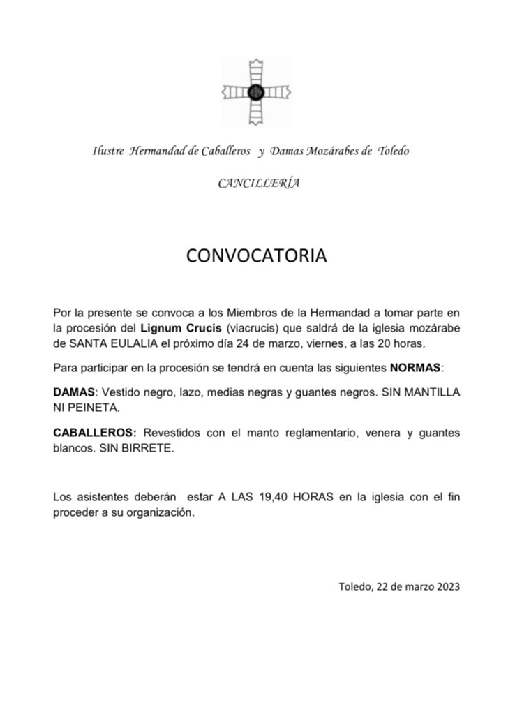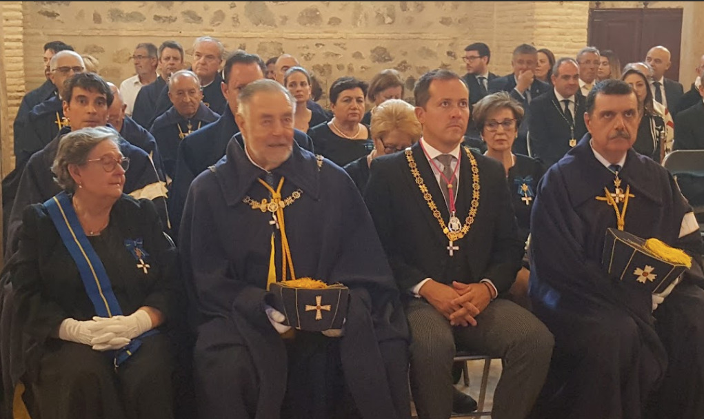 En el día de hoy, 24 de julio de 2023 en la Iglesia mozárabe de San Marcos, Santa Eulalia y San Torcuato, de Toledo, el Excmo. y Rvdmo. Sr. D. Francisco Cerro Chaves, arzobispo de la Catedral Primada de Toledo, y el M. I. Sr. D. Francisco Javier Hernández de Pinto, capellán mozárabe, acompañados por los miembros del Cabildo de la Hermandad Mozárabe y otros hermanos, por representantes de las distintas hermandades y Capítulos de se nuestra ciudad, y miembros de los grupos políticos que conforman la corporación municipal, así como un nutrido grupo de fieles y familiares, han celebrado la imposición del Collar Mozárabe al alcalde de la Ciudad de Toledo, el Ilmo. Sr. Don Carlos Velázquez Romo, que ante los evangelios y como testigo y padrino nuestro hermano mayor el Ilmo. Sr. D. Antonio Muñoz Perea, ha jurado las Constituciones de la hermandad, asumiendo como dice en el capítulo IV, artículo 14º, punto 2, el cargo de Hermano Mayor Honorario y Protector de la Hermandad.